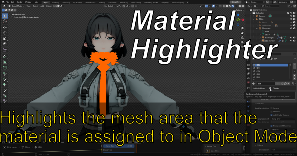 • 1.0.4 - When you load a new file and Mesh highlight was enabled, it get's disabled properly and won't cause to immediately highlight a material in the new loaded file